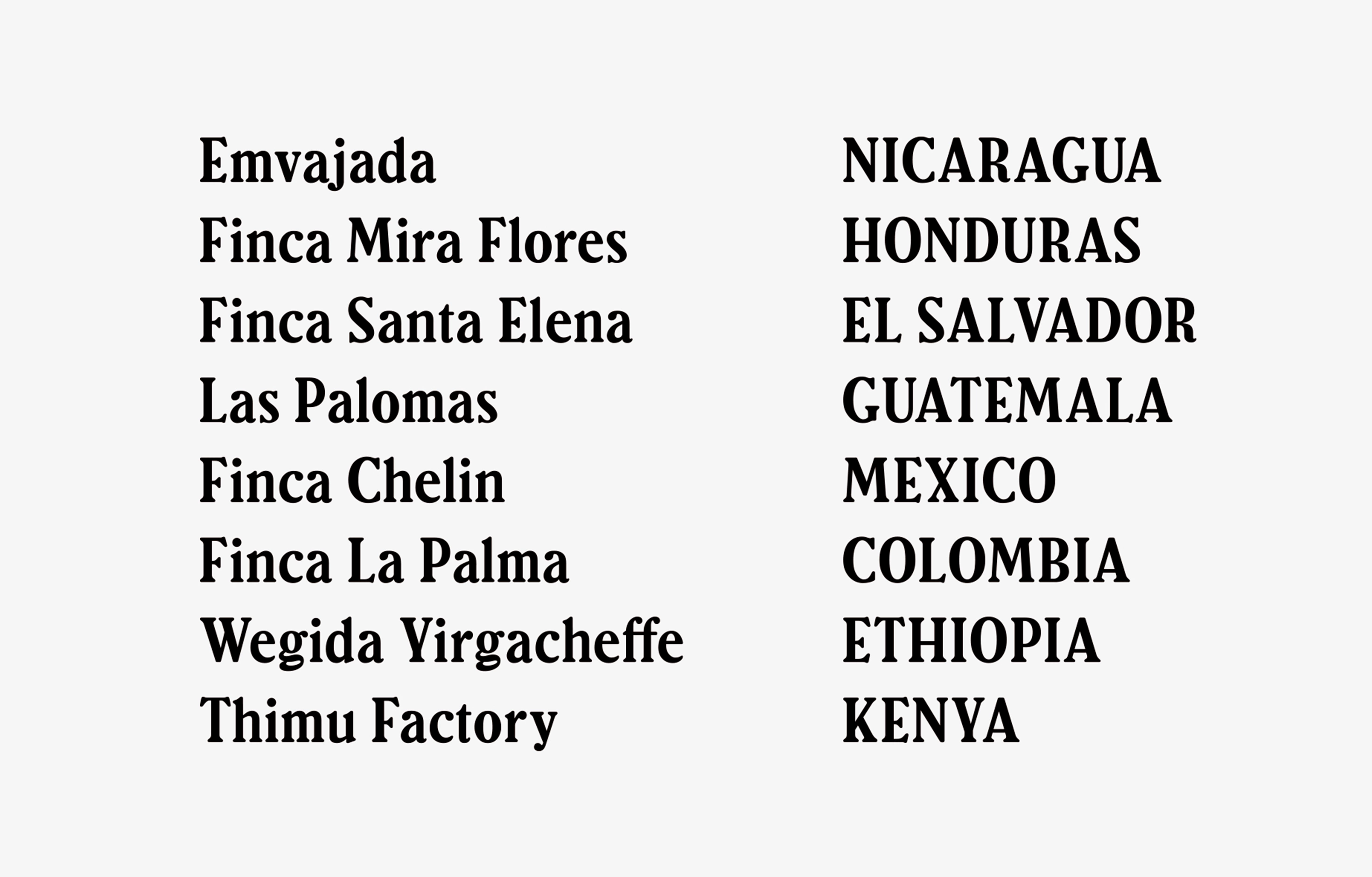 COFFEE COUNTYのヴィジュアルアイデンティティデザインを担当し、「Vibrant」と名付けた専用の書体を制作した。オーナロースターである森崇顕氏は、産地に直接赴き、農園主や生産者、風土など、コーヒー豆をその背景も伝えながら提供している。VibrantはCOFFEE COUNTYの顔となるロゴタイプであることはもちろんのこと、主要な商品であるコーヒー豆のパッケージにおいて、農園名と国名を店の思想やコーヒーの気配とともに伝えるために設計された同店の声でもある。