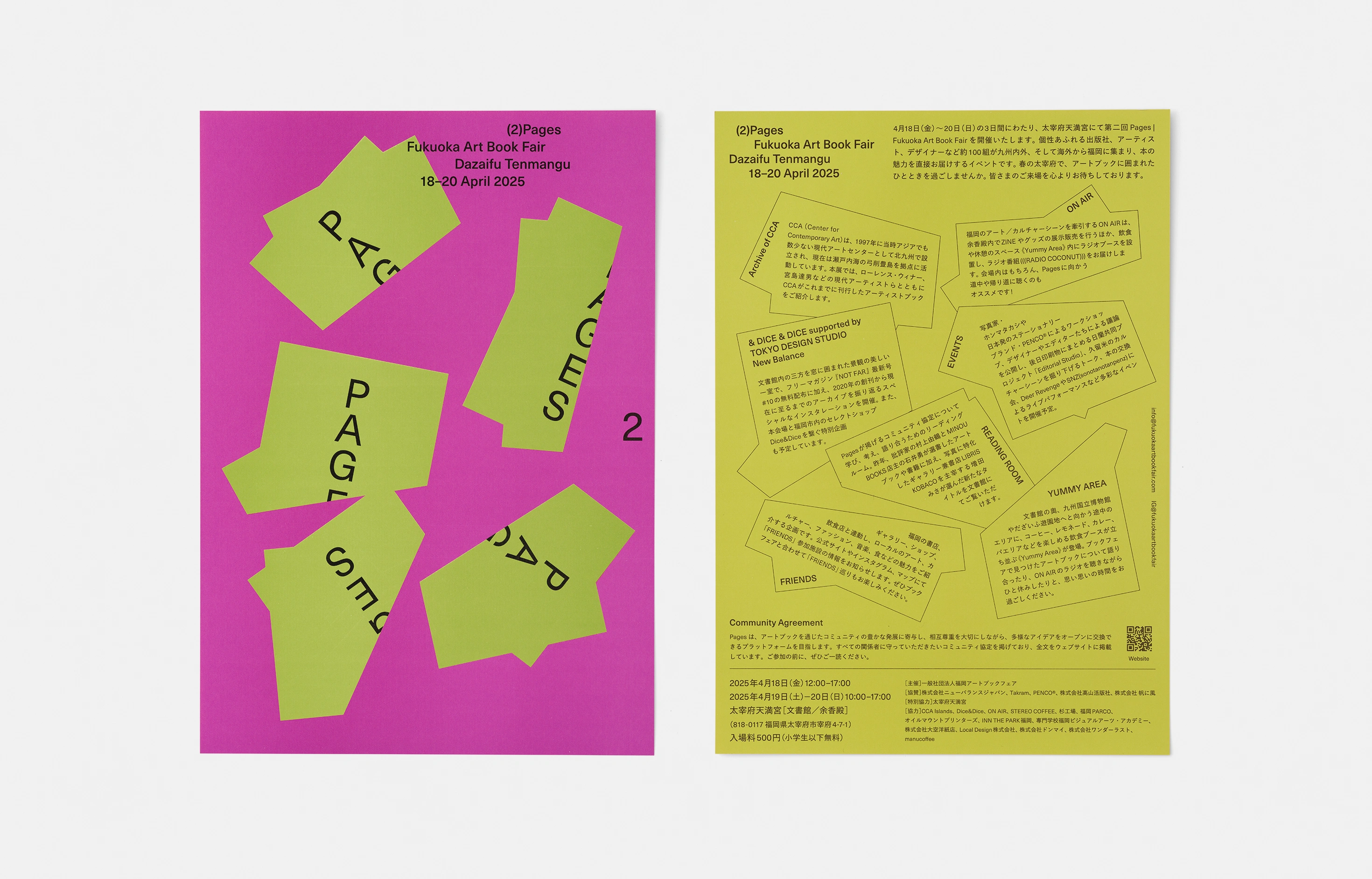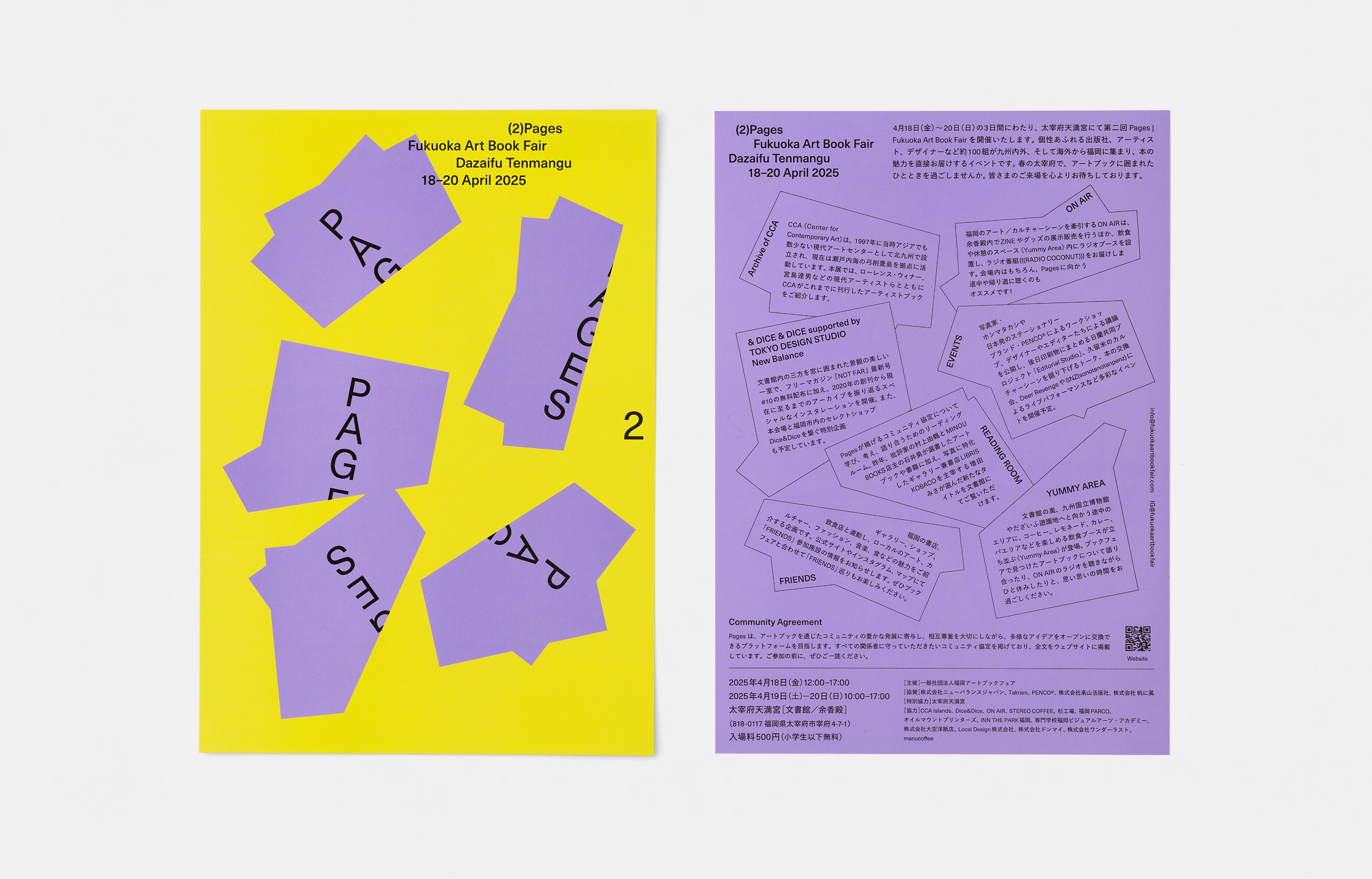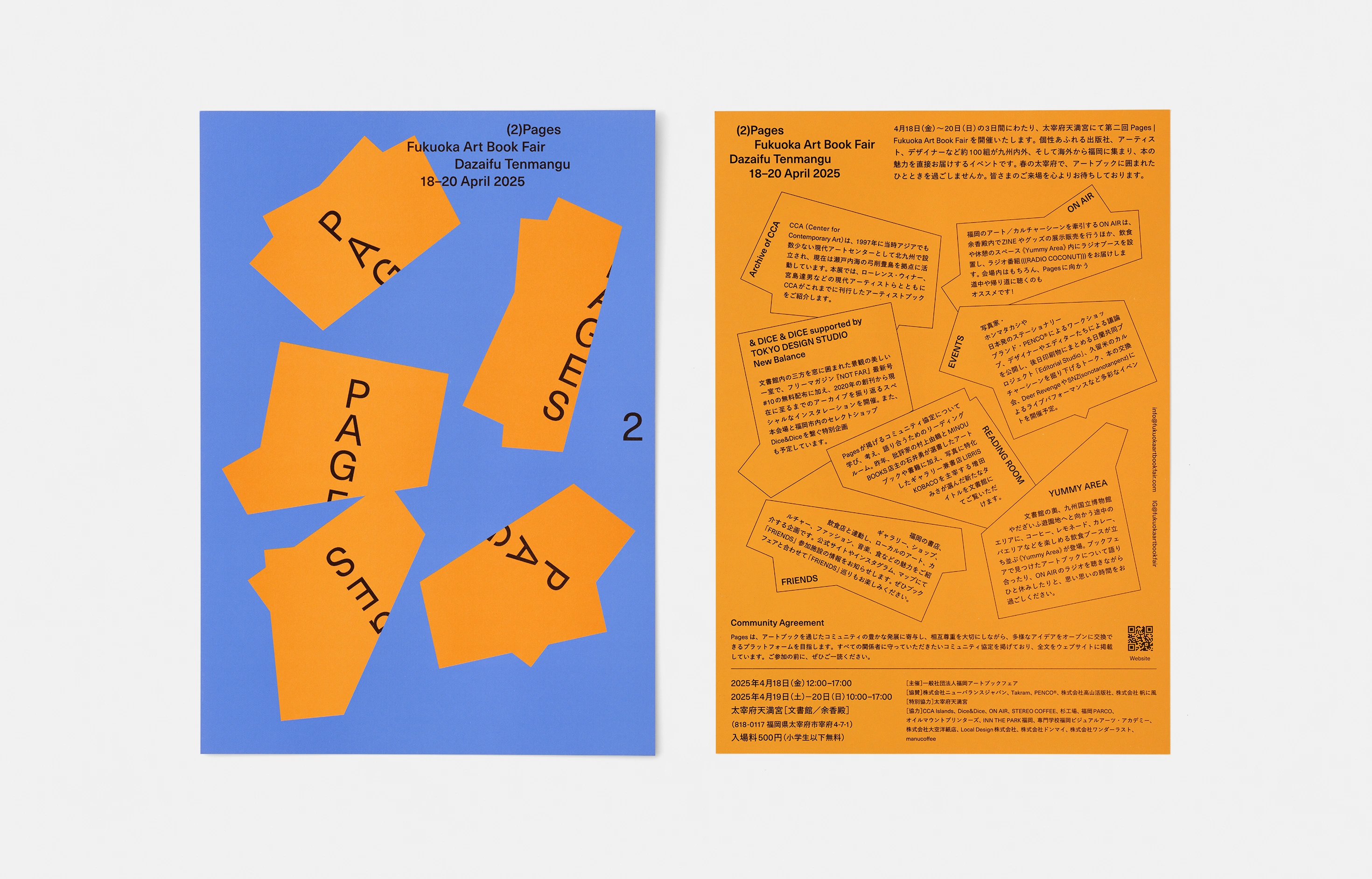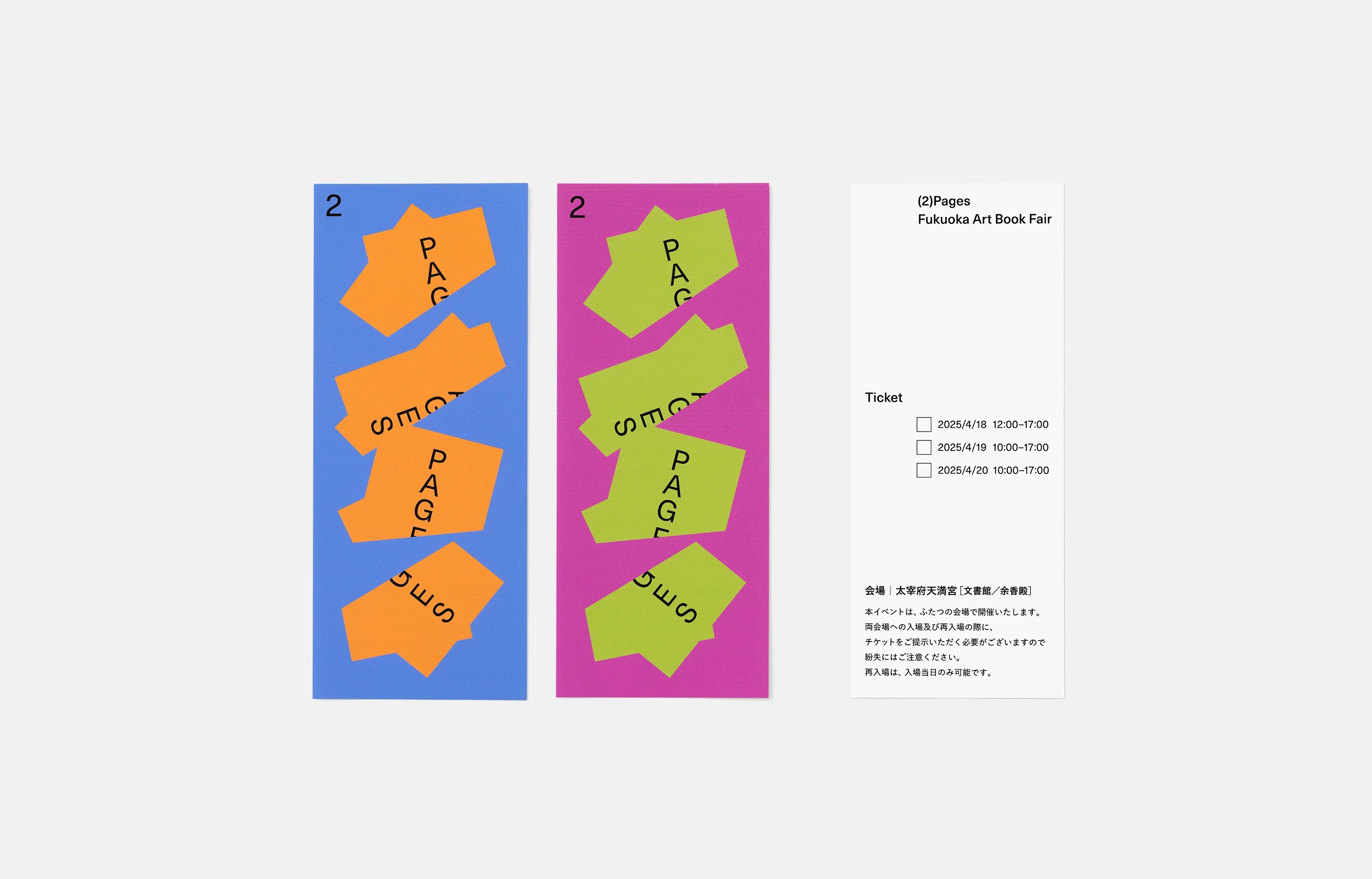 PAGES|Fukuoka Art Book Fair」の各種広報物をデザインした。ブックフェアには国内外の様々な地域からアーティストやデザイナーらが集う。彼らの個性を内包し、またその混ざり合いをポジティブに表現できるよう、現代的な広い色領域のパレットを用い、色彩同士がぶつかり合うことも美しさと捉える複数の配色を構築した。また、V.I.の「紙を折る=本になる」というコンセプトを、フェア名を印刷した複数の色の紙にランダムな折り罫を入れることで物理的に再現している。