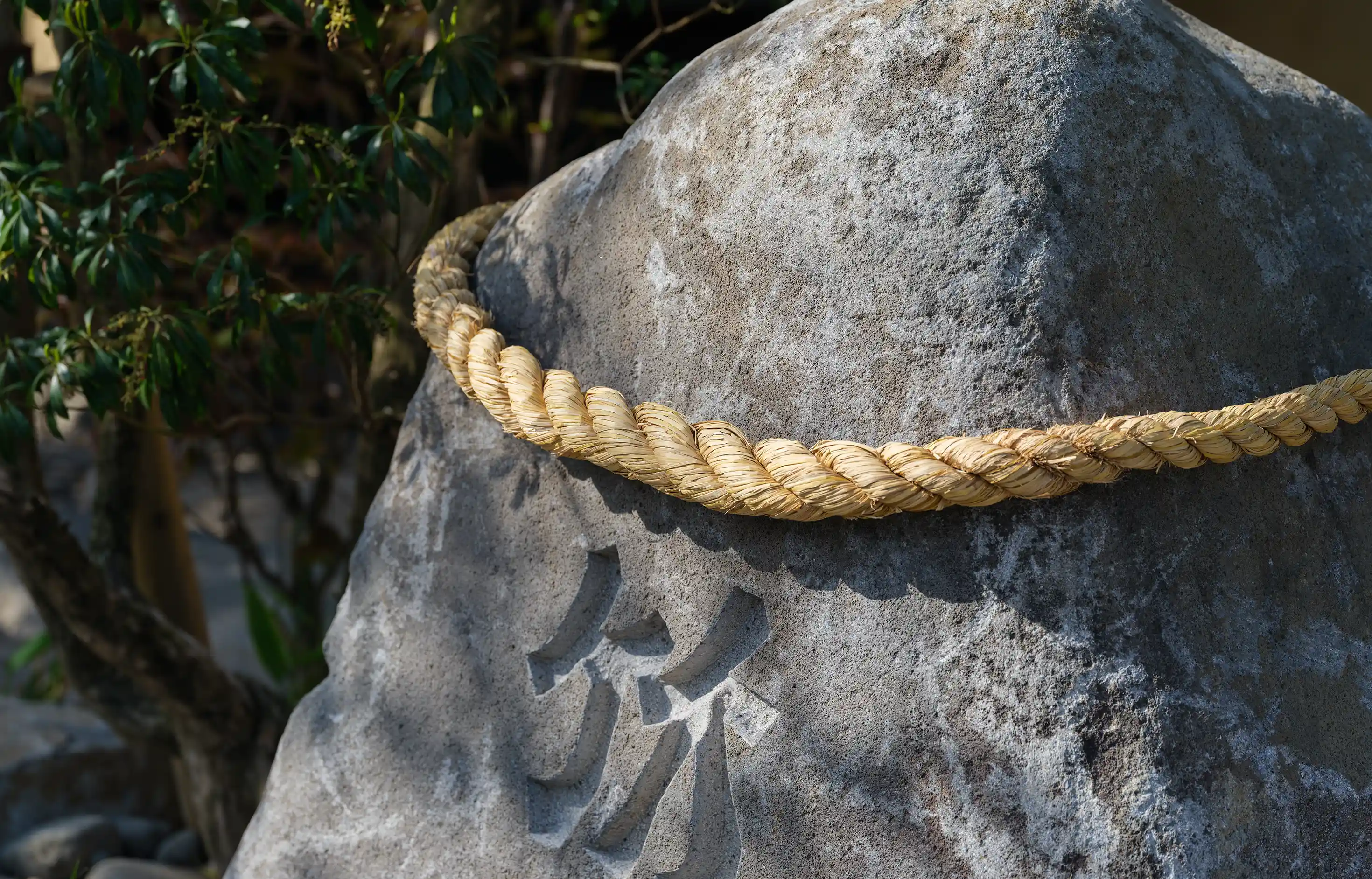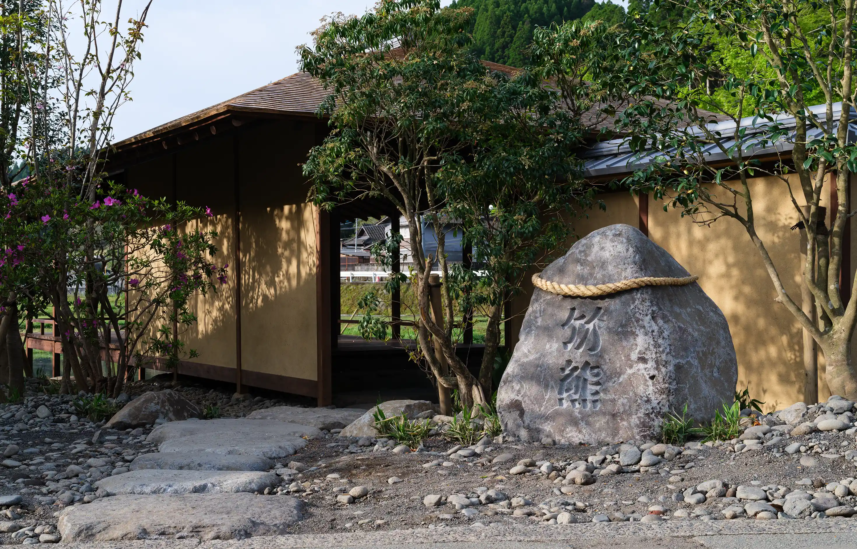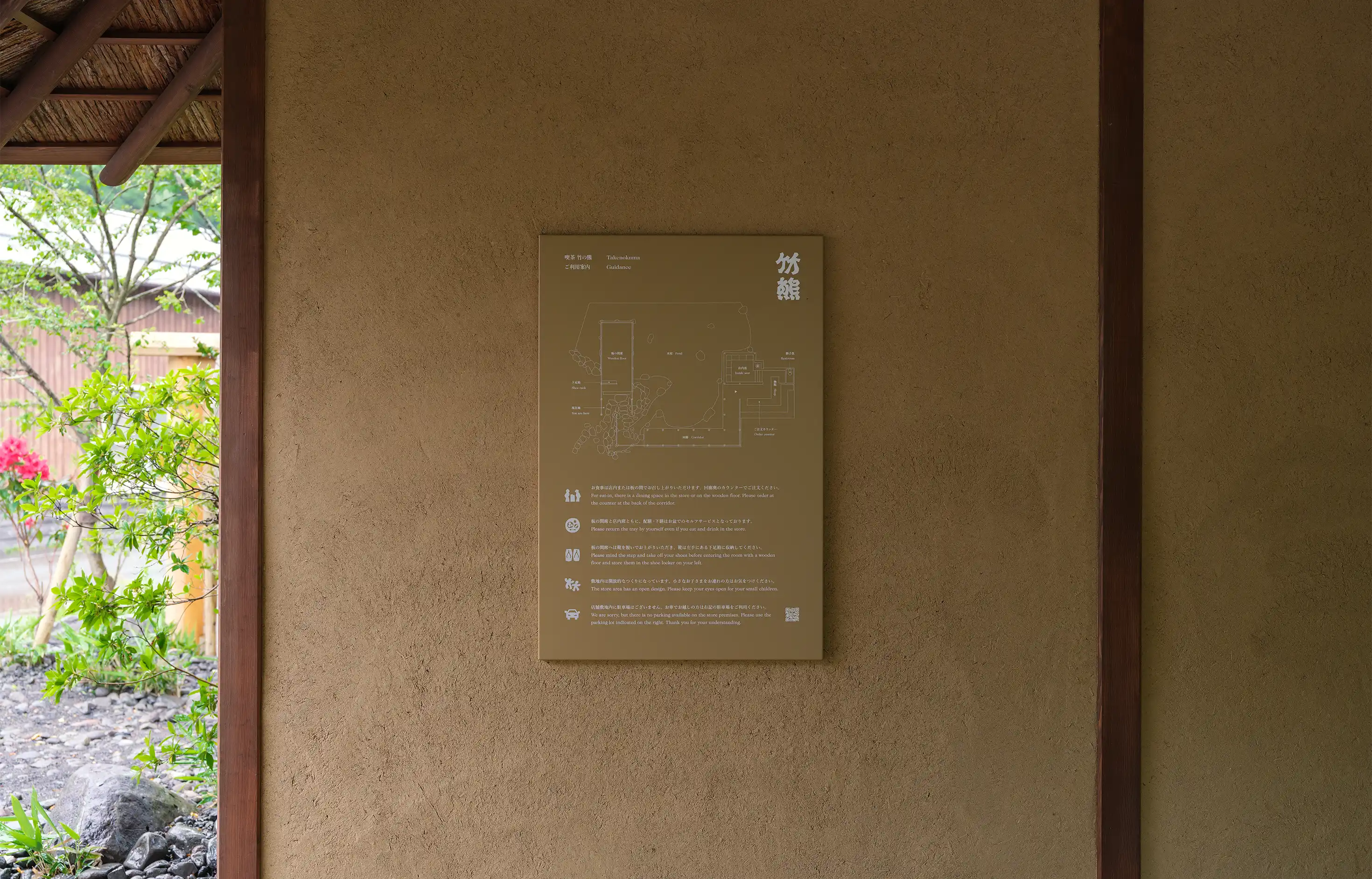 店名にもなった「竹熊」は、少なくとも数百年前より使われてきた地名であるにも関わらず、郵便事業の効率化のために地域の住所から消えてしまった。この地名を店名に借り後世に語り継いでいくためにも、人々の目に触れるファサードのサインは、長い年月に耐えうる頑丈さを持ちながら時代を経ていっそう美しく変化する自然石にし、「竹熊」というこの土地の記憶を力強く彫刻した。また、目の前の田んぼで採れた米を提供する喫茶竹の熊の象徴として、この石には南小国の大地で育った稲わらで編むしめ縄を毎年制作し巻いていく計画だ。