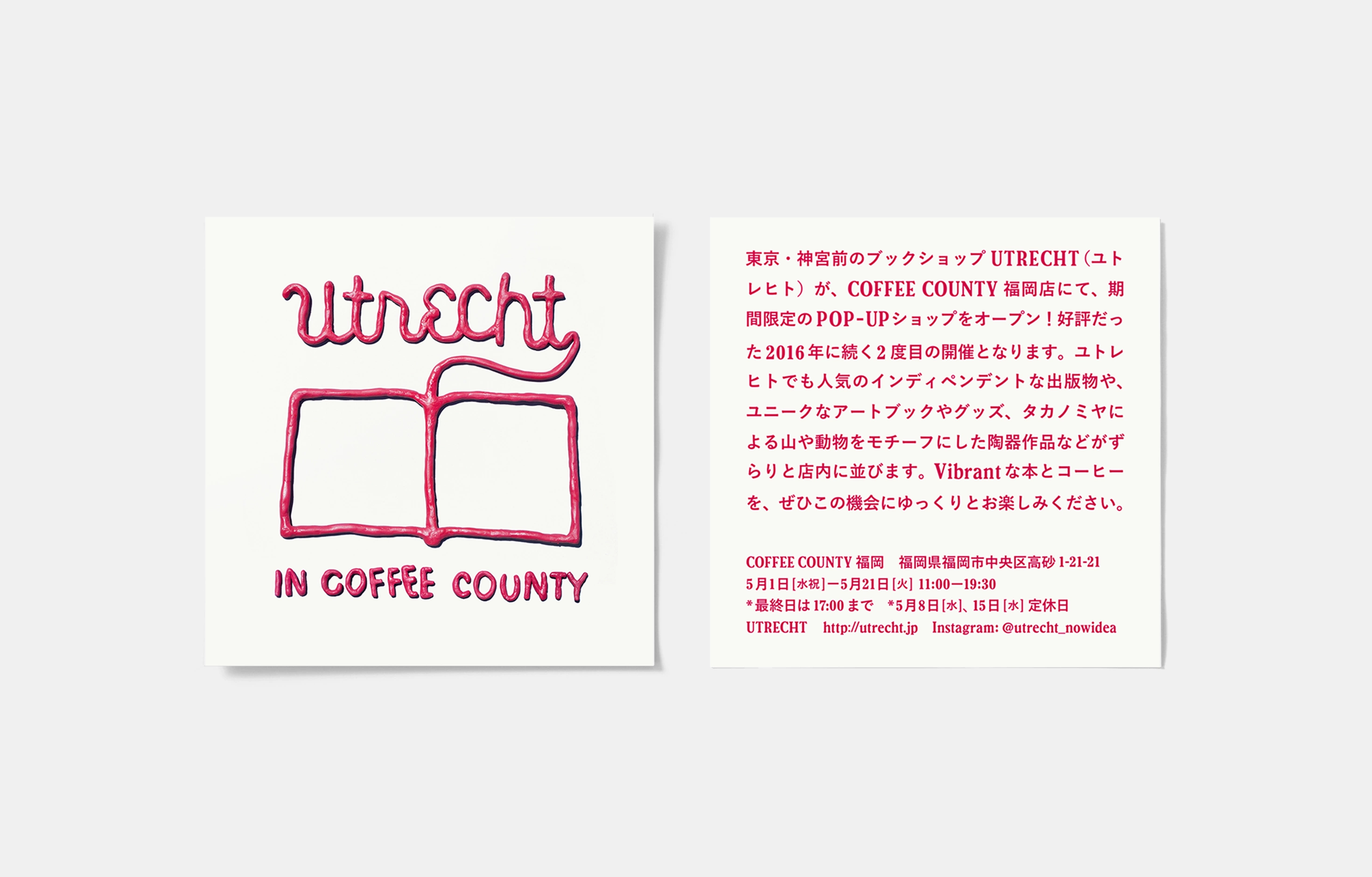 COFFEE COUNTY Utrecht in COFFEE COUNTY COFFEE COUNTYで行われたアートブックショプUtrechtによるPOP-UPイベント「Utrecht in COFFEE COUNTY」の企画協力とヴィジュアルデザインを担当した。 COFFEE COUNTYで行われたアートブックショプUtrechtによるPOP-UPイベント「Utrecht in COFFEE COUNTY」の企画協力とヴィジュアルデザインを担当した。 制作物一覧 専用書体 THE ETHIOPIAN ROAST トート
