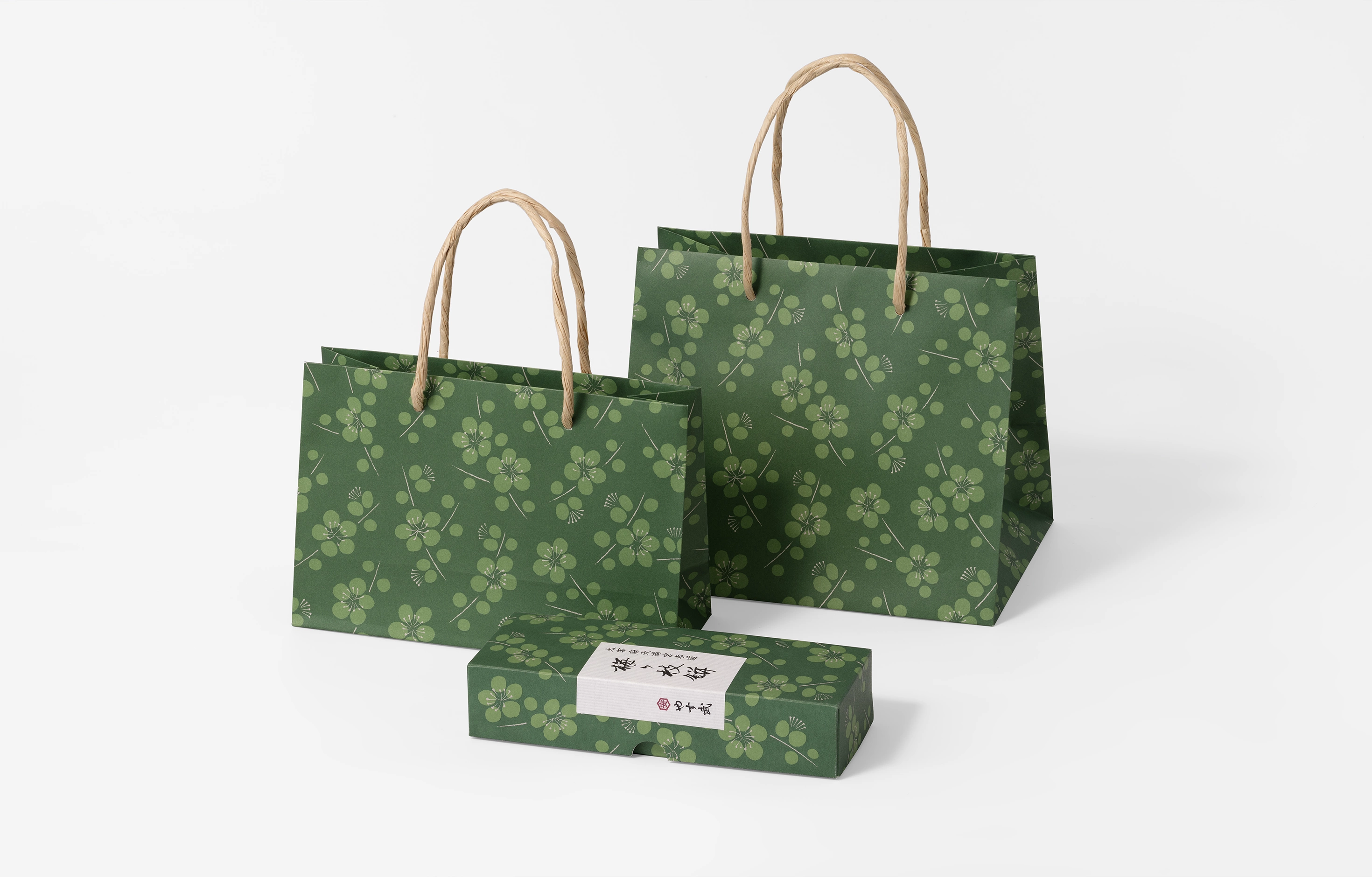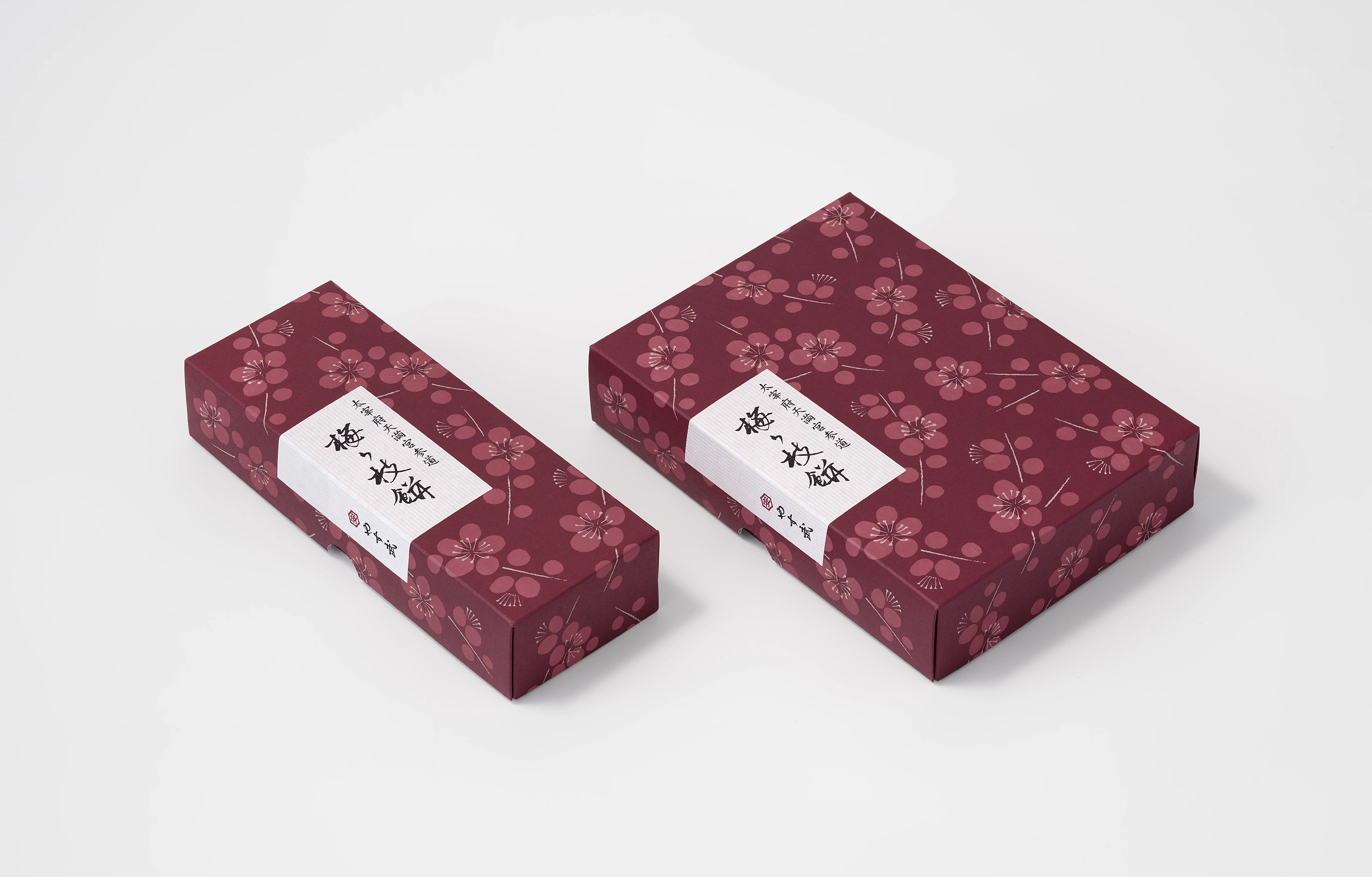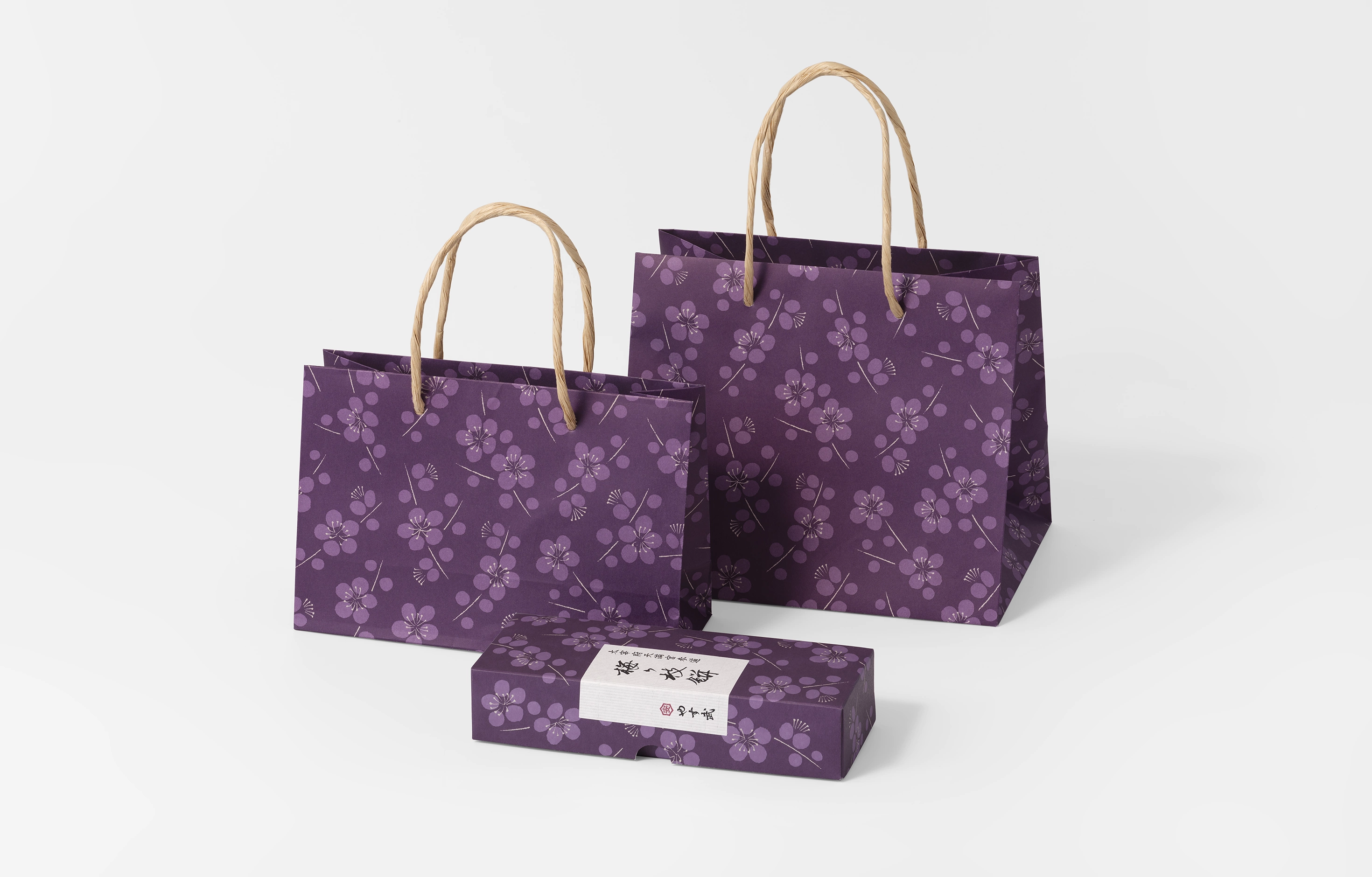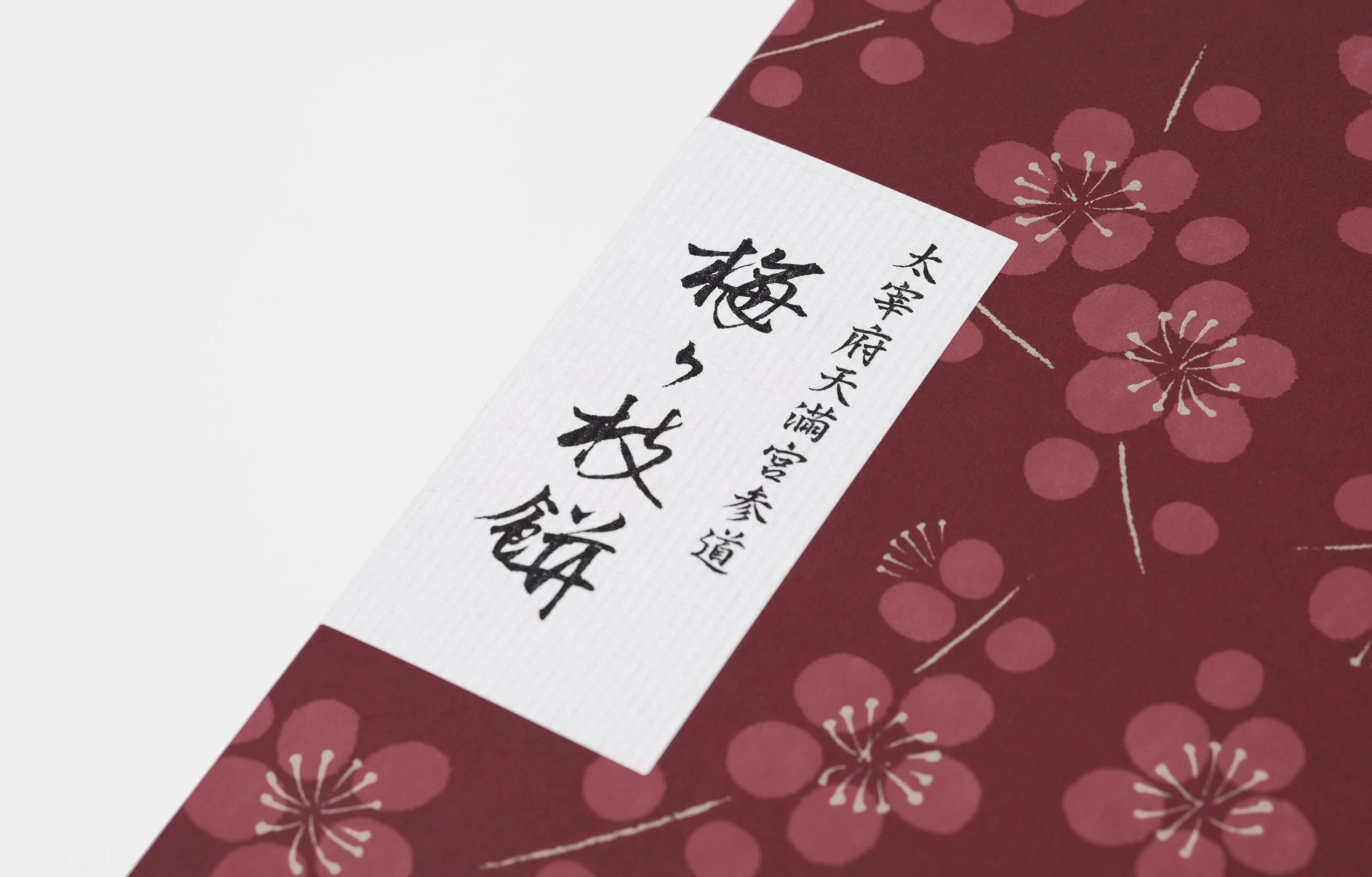 梅ヶ枝餅とは、老若男女に愛され、この地の人々によって長い年月をかけて共有されてきた文化財ともいえるような菓子である。したがってパッケージや紙袋のデザインにおいては、誰しもが共感できる梅ヶ枝餅らしいヴィジュアルを具現化したいと考え、太宰府の風景にふさわしい枝梅文様を考案した。この文様をやす武のパッケージ、紙袋、食べ歩き用の包み紙で共通して展開し、同店のヴィジュアルアイデンティティとしている。