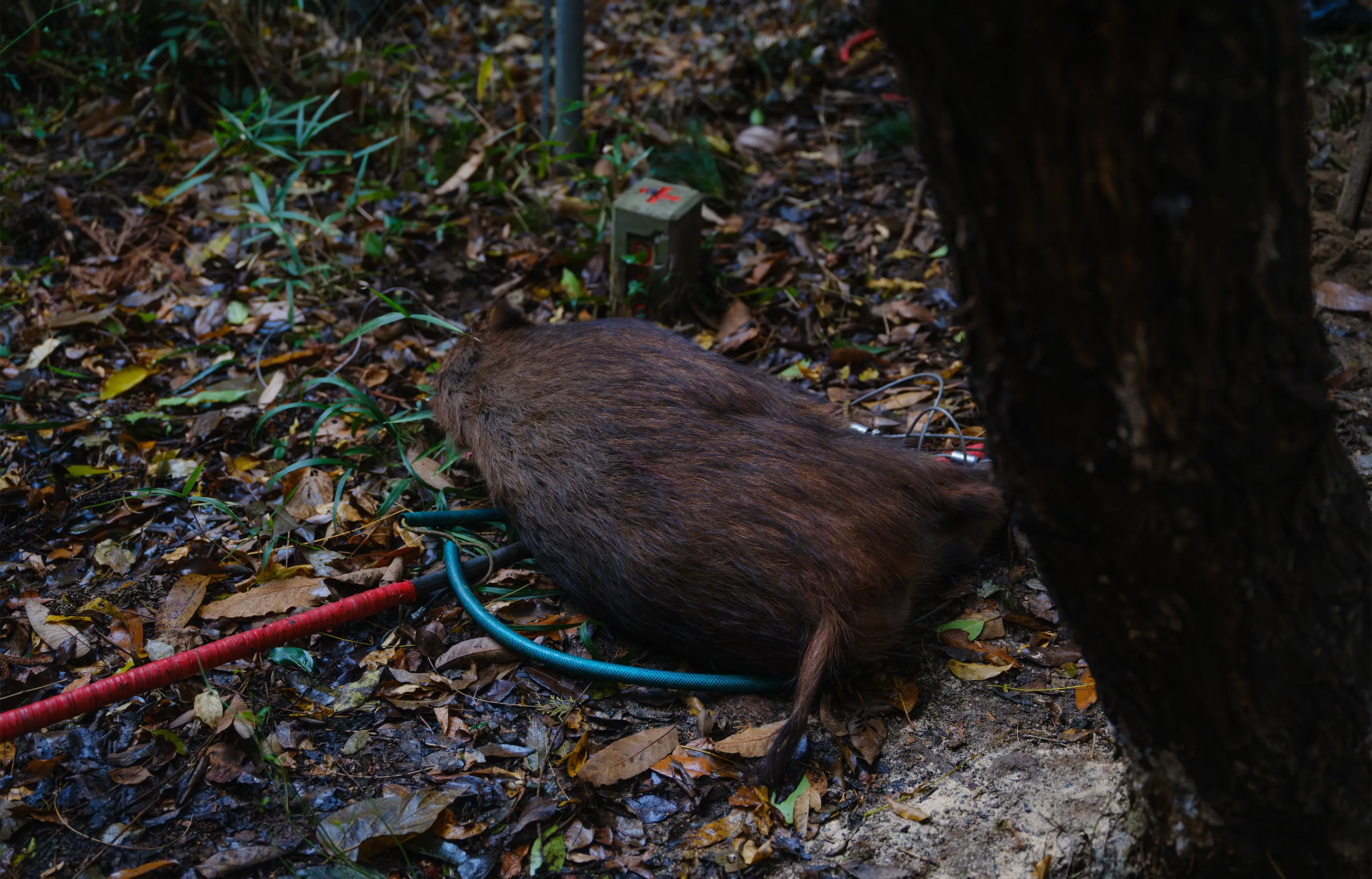 今回の取材で特に印象に残ったのが、二頭の猪と猟師たちの戦いでした。人家にほど近い山裾に設置された檻に案内されると、猟師いわく「小さい」猪が目と鼻の先で荒々しく鼻息を立て暴れ回っています。その様子から生身の人間では命が危ぶまれることはひと目で分かり、雄の一頭が手足を拘束される最中に断末魔の叫び声をあげた瞬間は、恐怖と憐れみが入り交じり言葉を失くしてしまいました。捕獲作業が始まって数十分が過ぎたでしょうか、若い猟師の手で四肢と顔を縛られ身動きが取れなくなった二頭は、運搬車に積まれ加工所へと連れて行かれました。