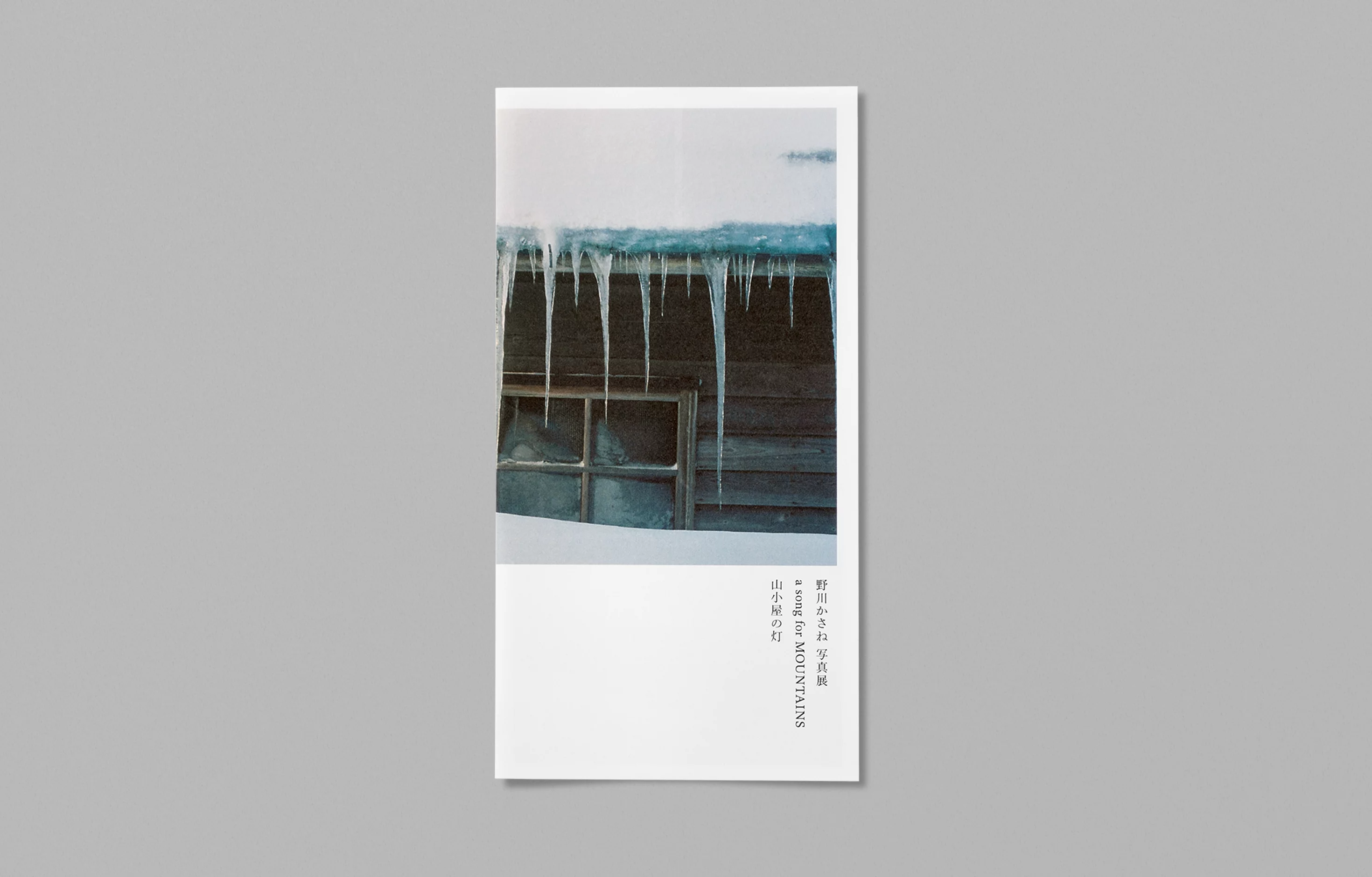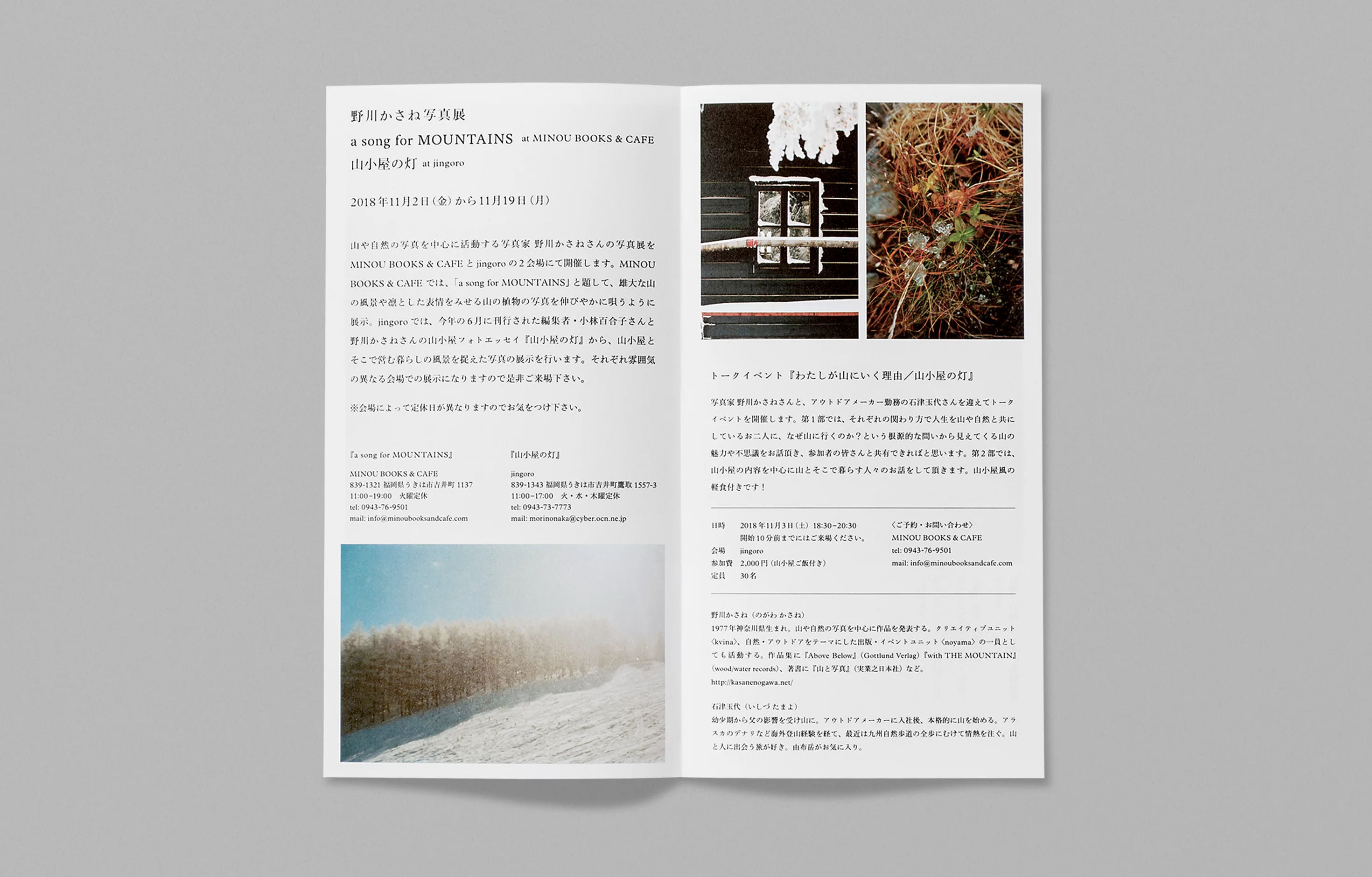 福岡県うきは市のMINOU BOOKSとjingoroで共催された、写真家の野川かさね氏による「a song for MOUNTAINS/山小屋の灯」展のヴィジュアルデザインを担当。同氏の写真に映った静かな山小屋の風景や厳しくも温かみのある自然の姿を表現した。本展にあわせて制作されたカレンダーもデザインしている。