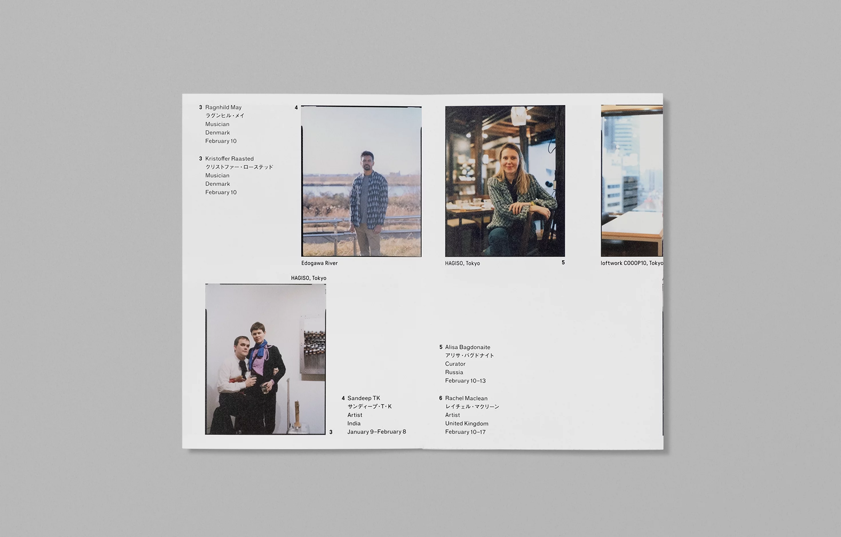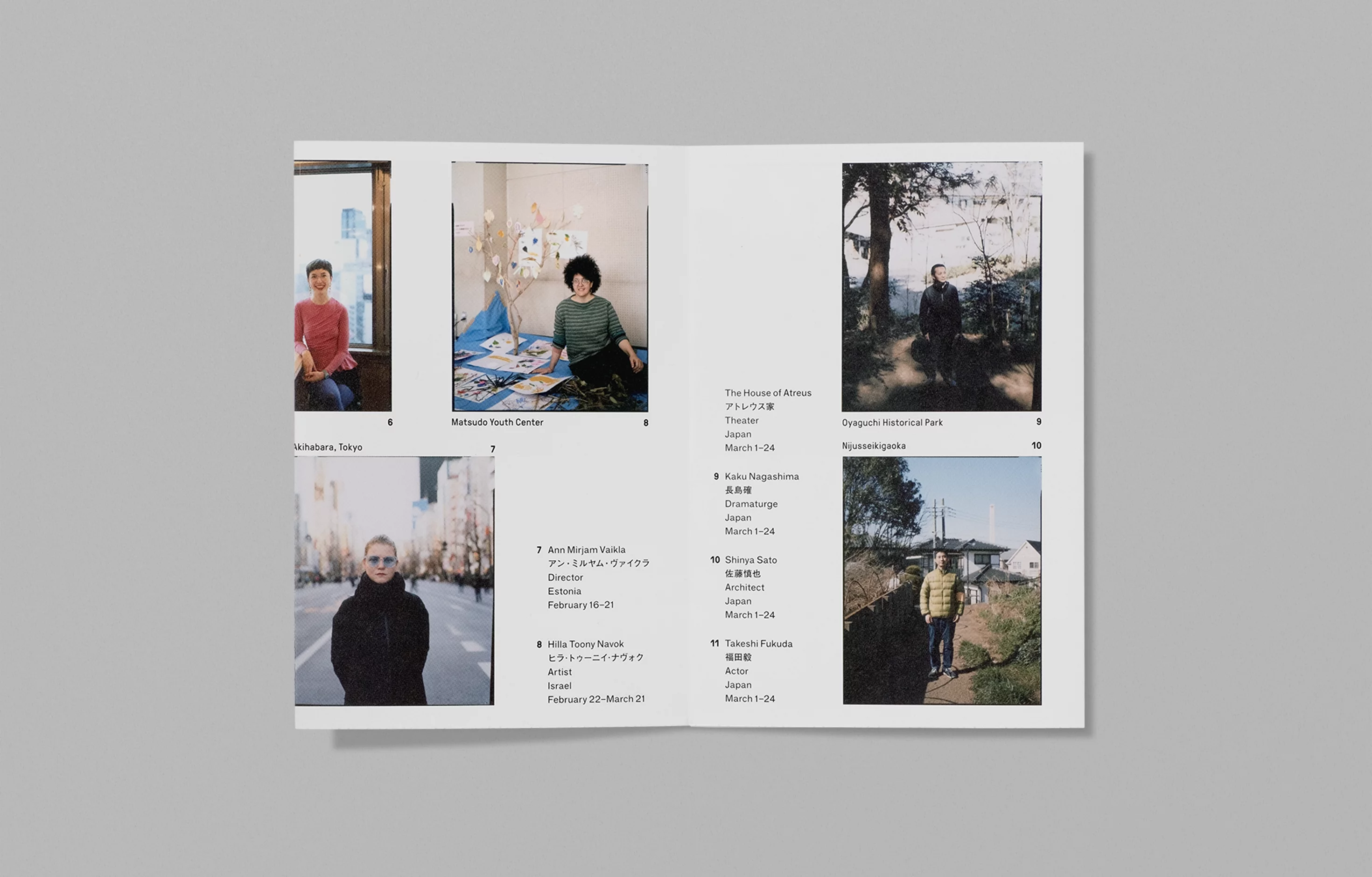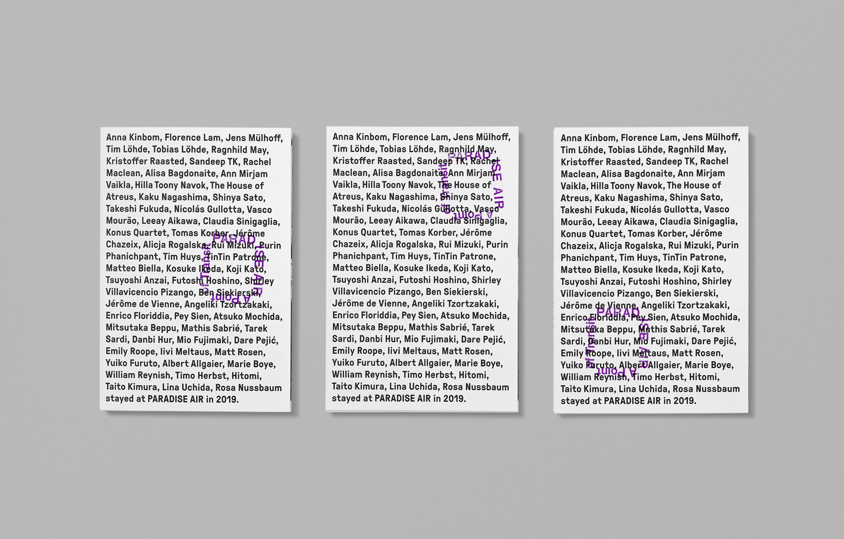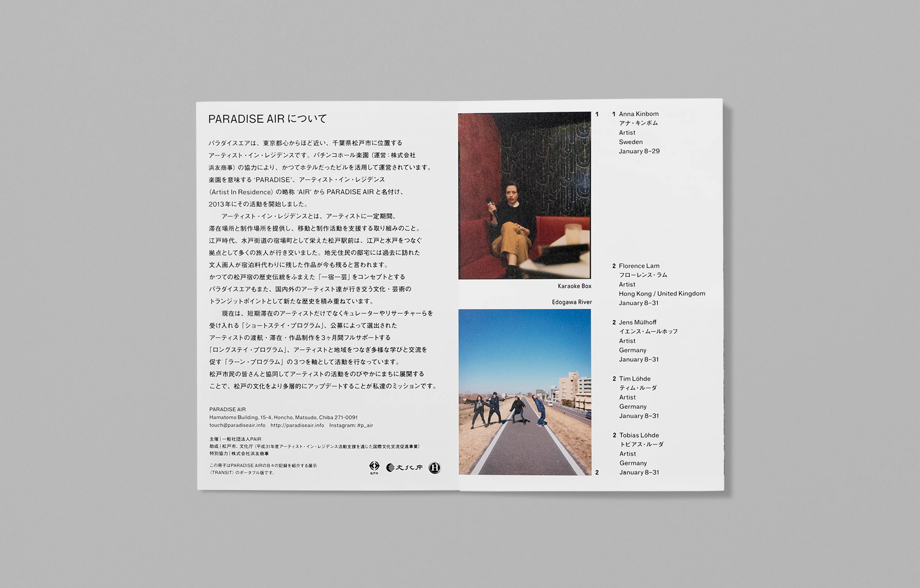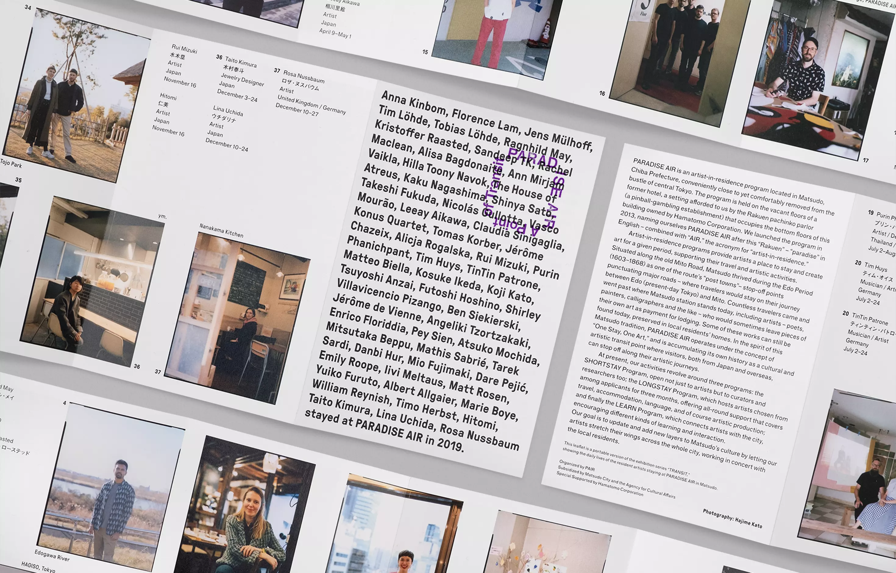 千葉県松戸市のアーティスト・イン・レジデンスPARADISE AIRが発行するアニュアルドキュメントのデザインを担当。長尺の蛇腹折り冊子に滞在アーティストの情報と写真を時系列にレイアウトし、紙面を広げると年間の活動を俯瞰できる記録物とした。表紙は毎年書体を変え、滞在したアーティストの名前を使って構成している。
