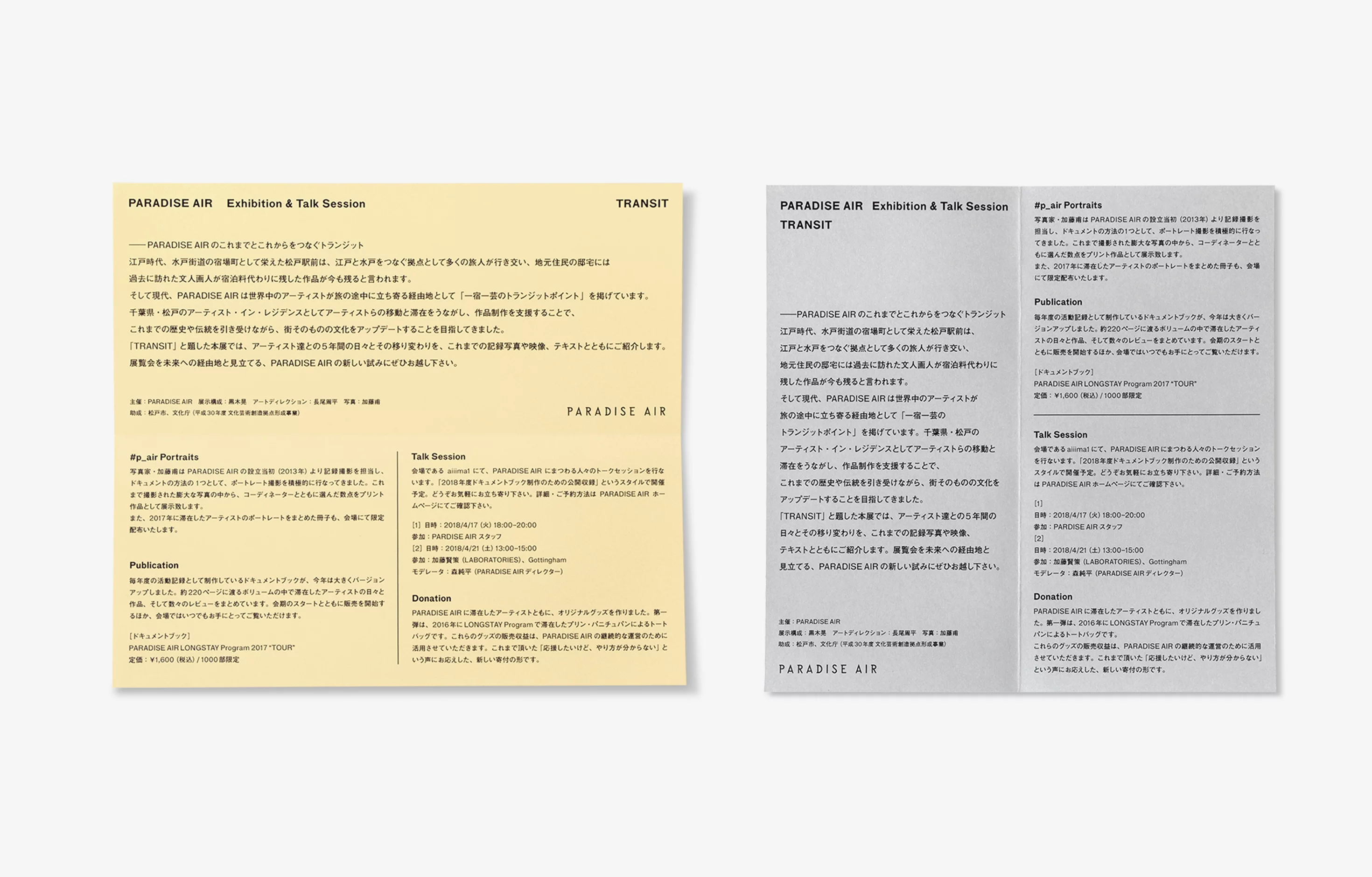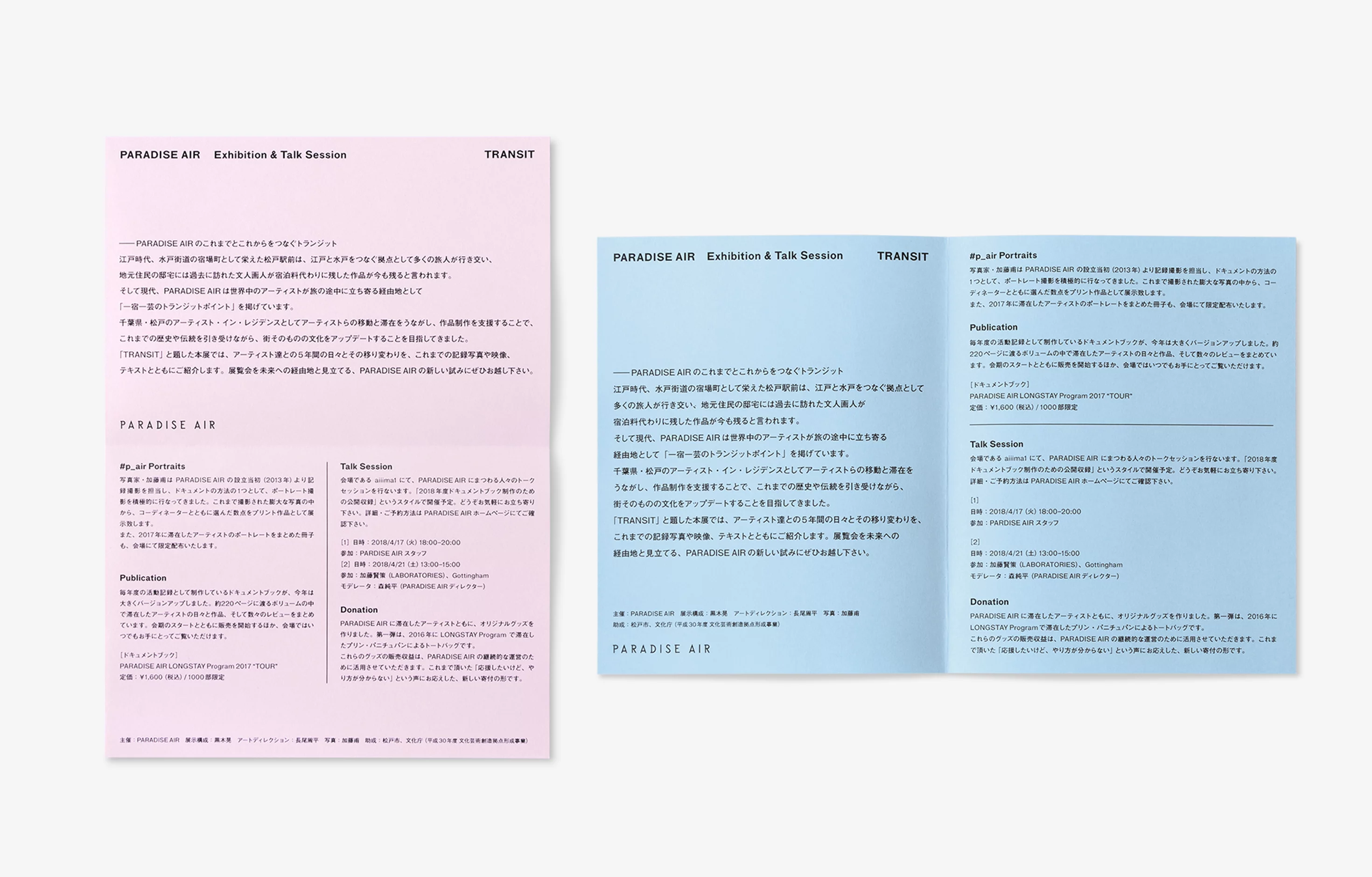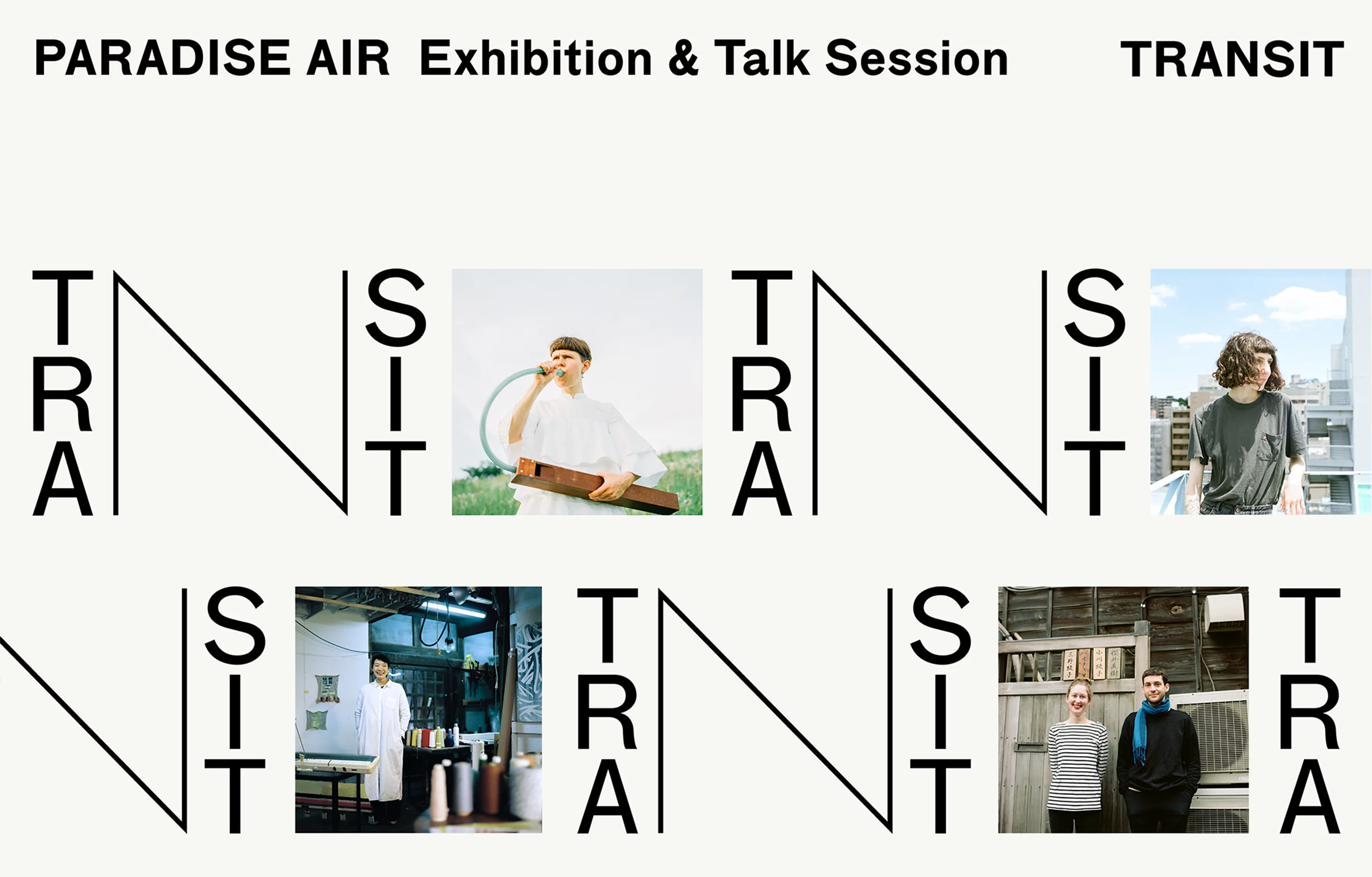 渋谷aiiima 1にて開催された、千葉県松戸市のアーティスト・イン・レジデンスPARADISE AIRによる「Transit」展のグラフィックデザインを担当した。滞在したアーティストたちの様々な「Transit」を表す可変のロゴをメインヴィジュアルとし、会場で配布されるハンドアウトもロゴに合わせて数種類の紙を使用した。会場ではアーティストとの5年間の日々とその移り変わりが、記録写真や映像、テキストとともに紹介される。