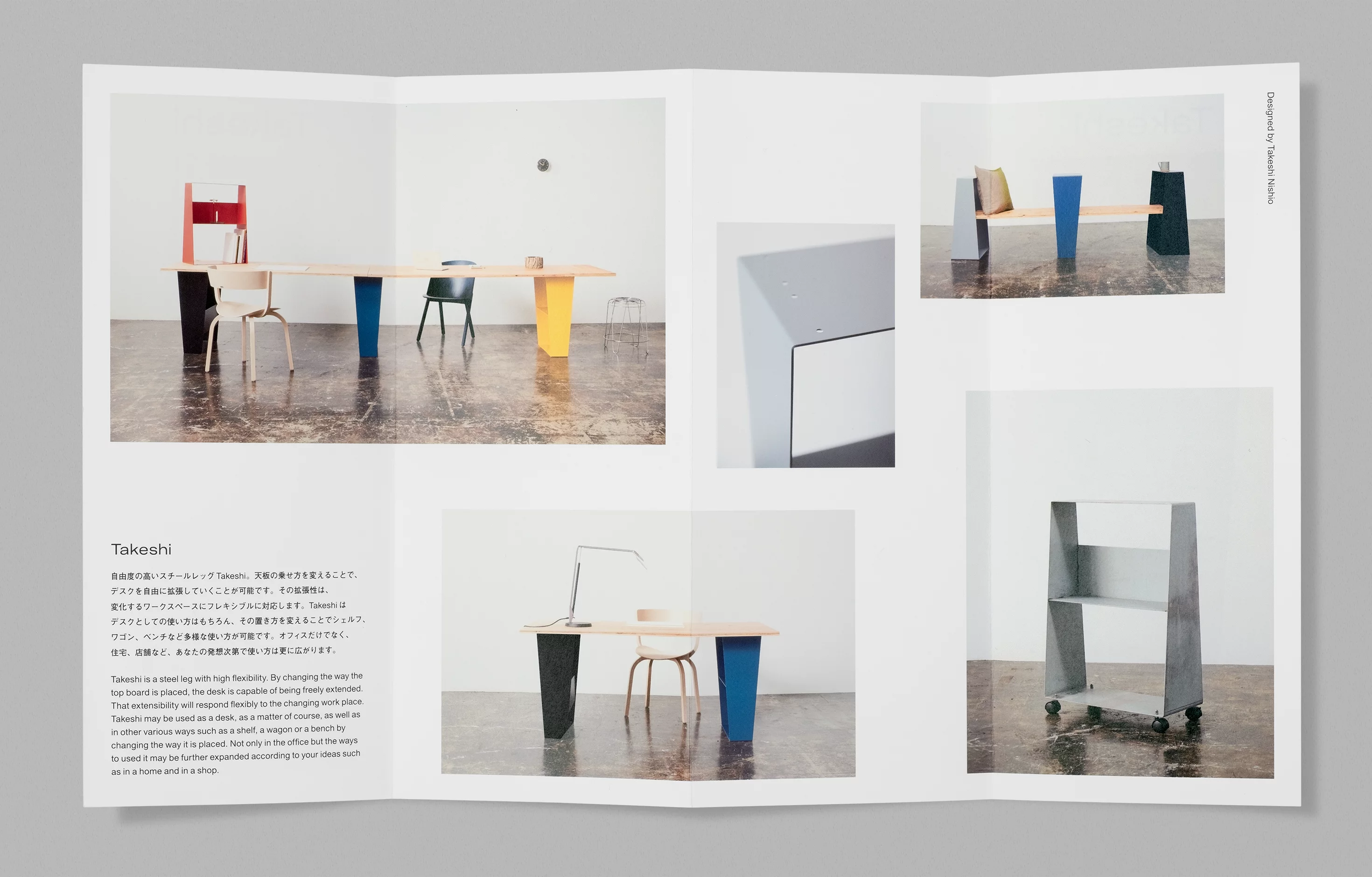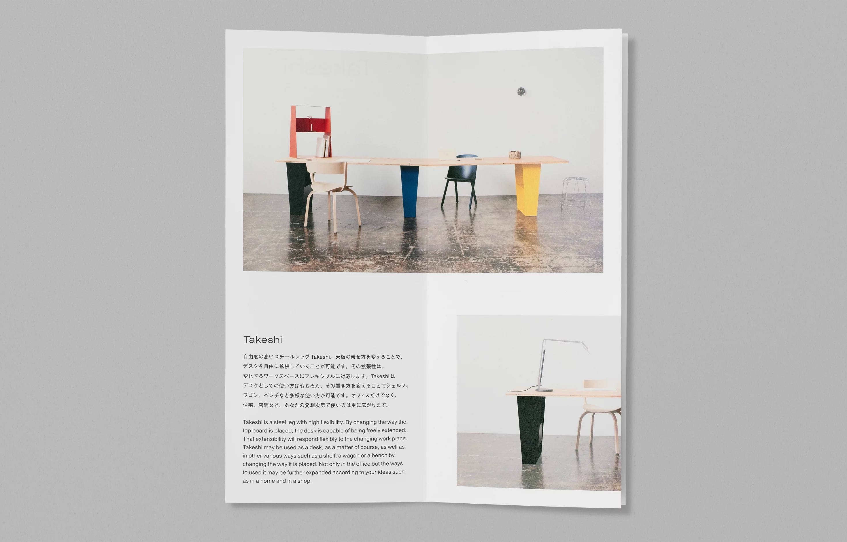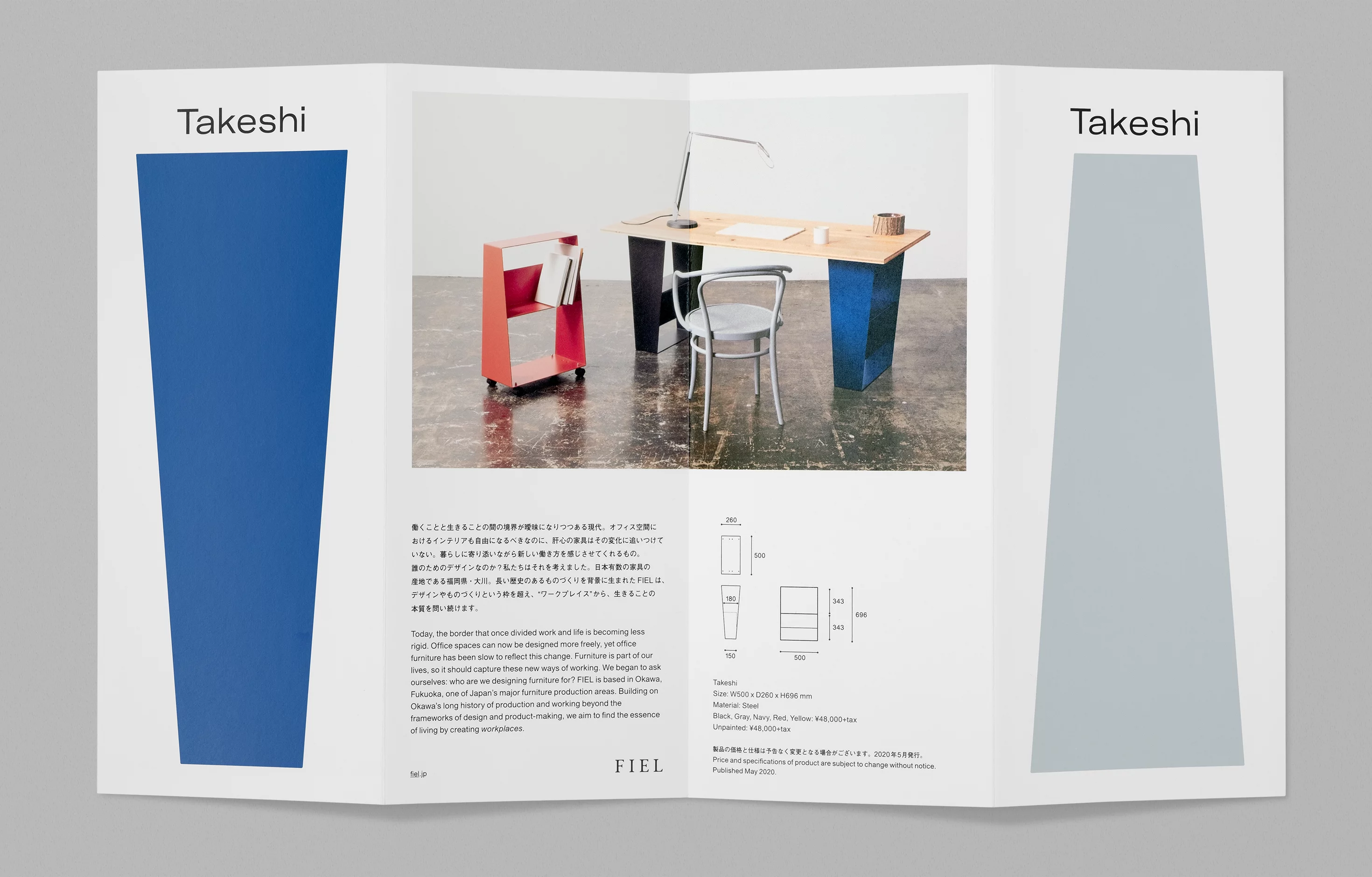オフィス家具ブランドFIELのスチールレッグ、Takeshiのリーフレットデザインを担当。DAYS.の西尾健史氏によりデザインされたプロダクトの特徴的なかたちをグラフィカルに扱い、デスク、シェルフ、ワゴン、ベンチなど様々な使い方が可能なプロダクトの拡張性と柔軟性を表現した。